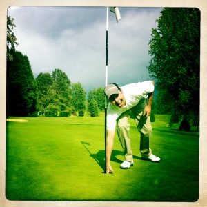 The two days after that I played a lot of golf, but I’m pretty sure we all knew that I went out to East Moreland and hit 18 yesterday morning and then teed up 18 at Columbia Edgewater in the afternoon where I played with a prospective member and the GM Bryan Fisher. Bryan has been playing golf for about 18 years and had never aced a hole. We had been talking about that fact early in the round then low-and-behold he holed out the par 3 11th hole! It was awesome. I haven’t played a round with someone who got an ace and it was such a surreal moment. We couldn’t see the cup from the tee box, but all knew that it was a great shot. Walking up, his ball wasn’t on the green but there was a chance it could have gone over the back edge. He went up to check and it was in the cup! Here’s a shot of him getting his ball back: